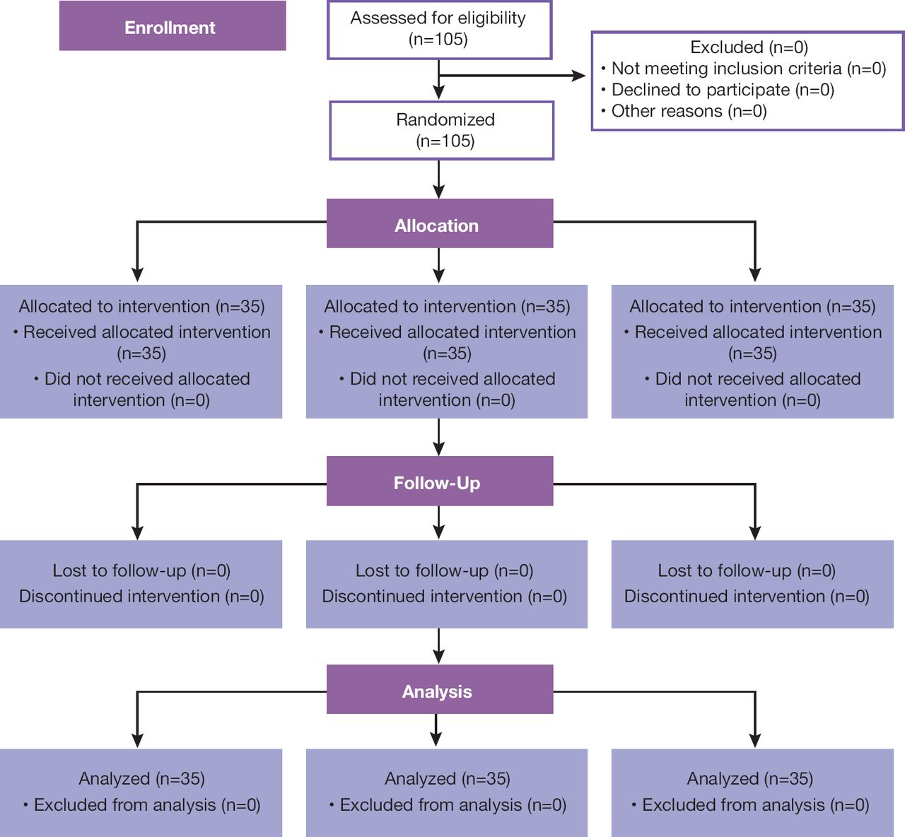 One hundred and five (105) participants were randomized and enrolled in the study (Figure 1). Participants were not blind to their product allocation as they are readily available at retail and branded on the product. The study director (JGQ) was responsible for allocation concealment. The examiner (CRG), recorder (JGQ), and assistant (RK) were blinded to the treatment randomization, group allocation, and records of earlier examinations at subsequent visits.