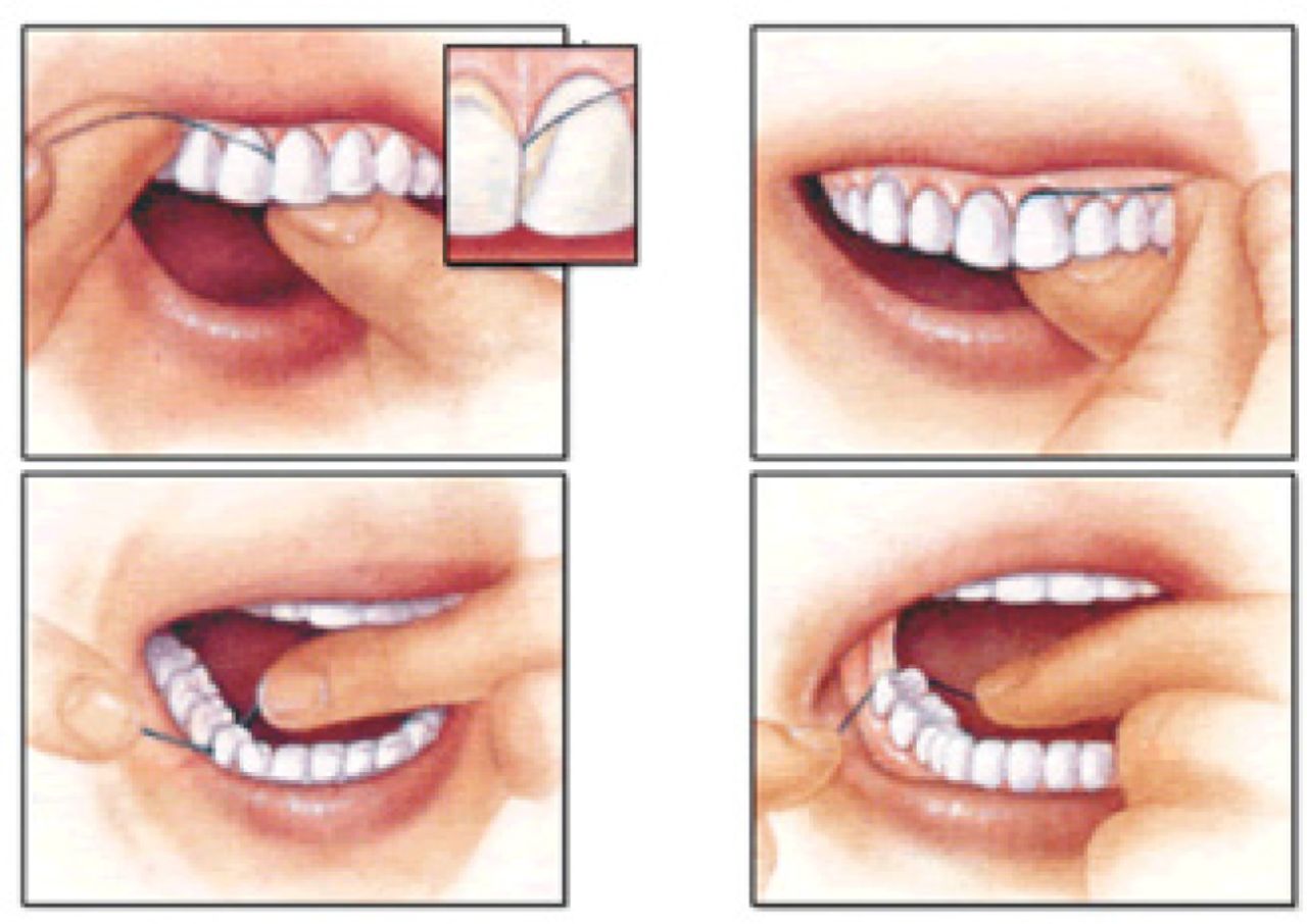 Gently guide floss between the teeth by using a zig-zag motion. Do not snap floss between your teeth. Contour floss around the side of the tooth.