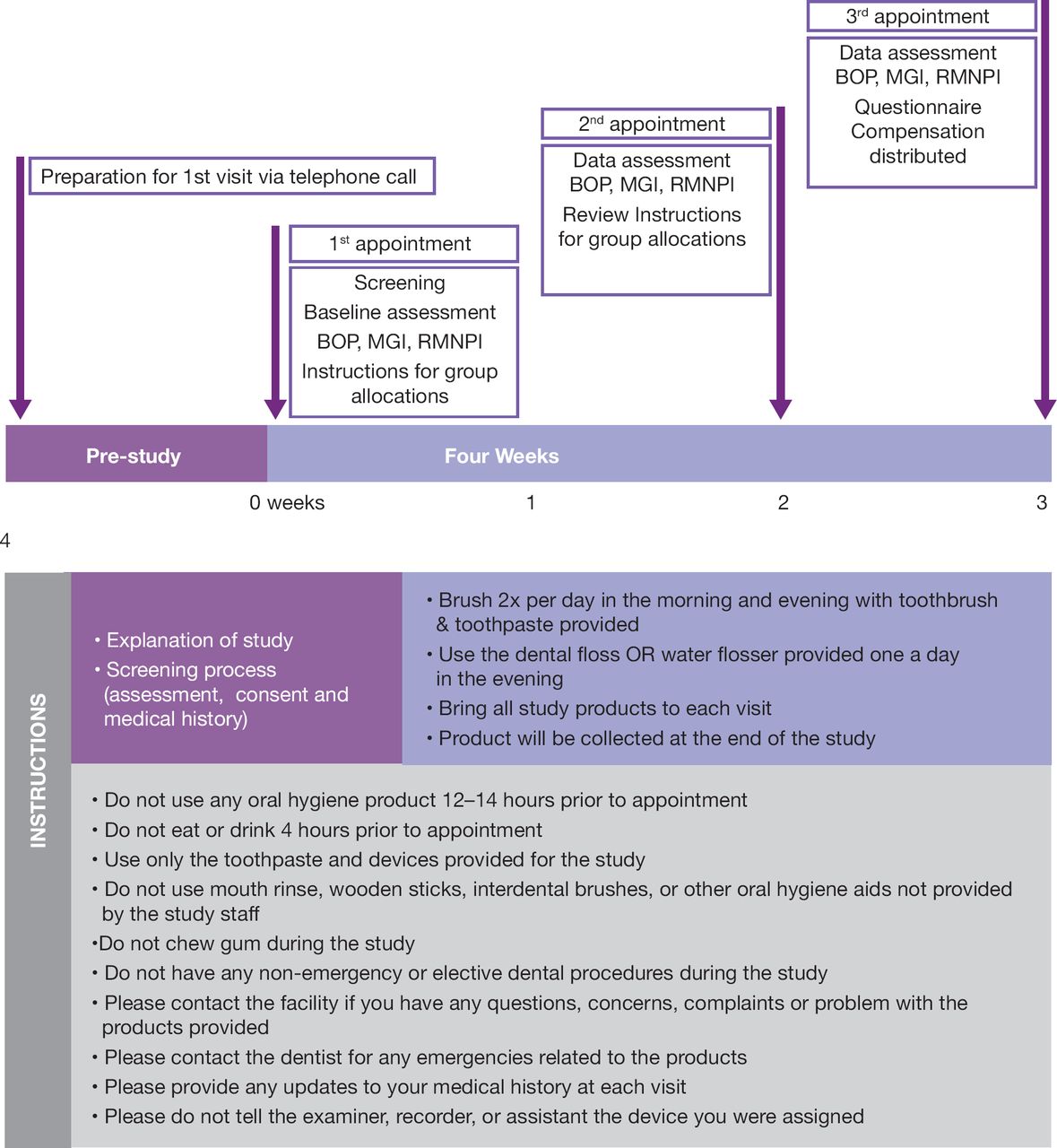 Blinding a subject to the devices is not possible because they are commonly available on the market and visually very different from each other. The 4-week study duration adhered to the American Dental Association requirement to demonstrate efficacy measured by changes in gingival health. Longer study durations may speak to issues concerning motivation and patient compliance with home care regimens and questions regarding the impact of routine use of a water flosser to reach a state of periodontal health as outlined in the 2017 World Workshop new classification scheme for periodontal and peri-implant diseases and conditions.60